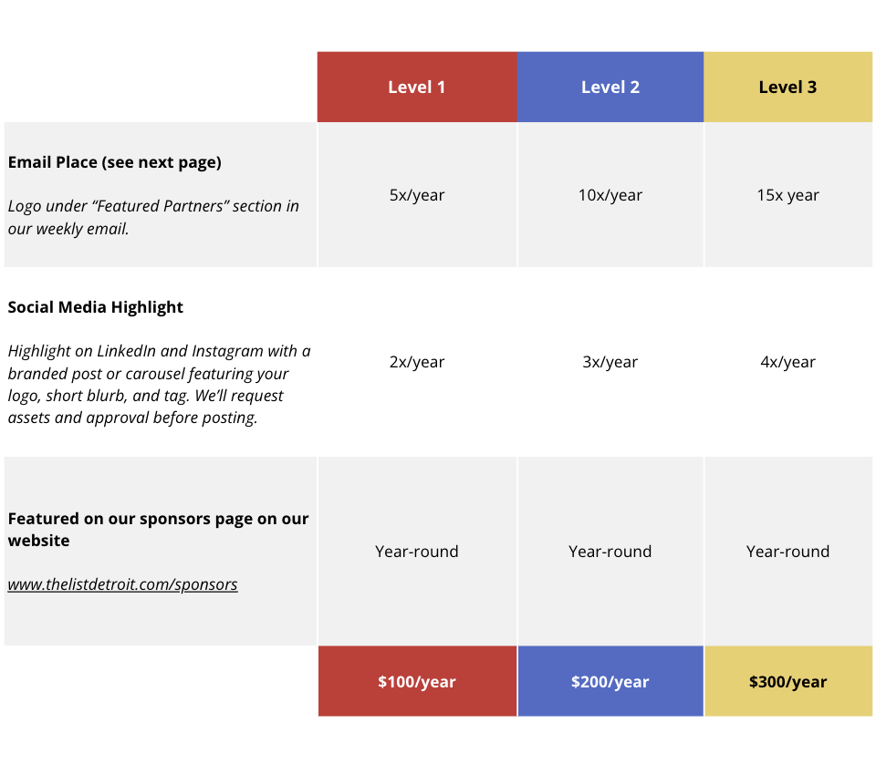 Support The List Detroit and become a sponsor! Check out sponsorship levels here or send us an email at hello@thelistdetroit.com.